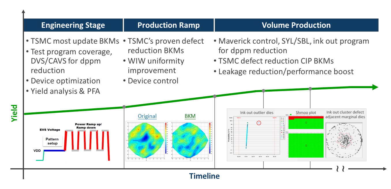 Starting from engineering stage all the way to production, we focus on device window check;then yield and physical failure analysis, followed by test program optimization and inline correlation to TSMC for yield management.
