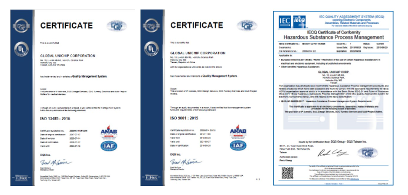 GUC has been certified ISO 9001, IECQ QC08000, and ISO 13485 since 2001, 2011, and 2017, respectively