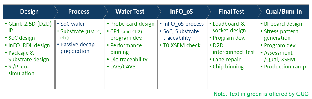 GUC offers total service package including GLink-2.5D (D2D) IP, SoC design, InFO_RDL/Package design, system level SI/PI co-simulation, bring up tests, product qualification and ramping.