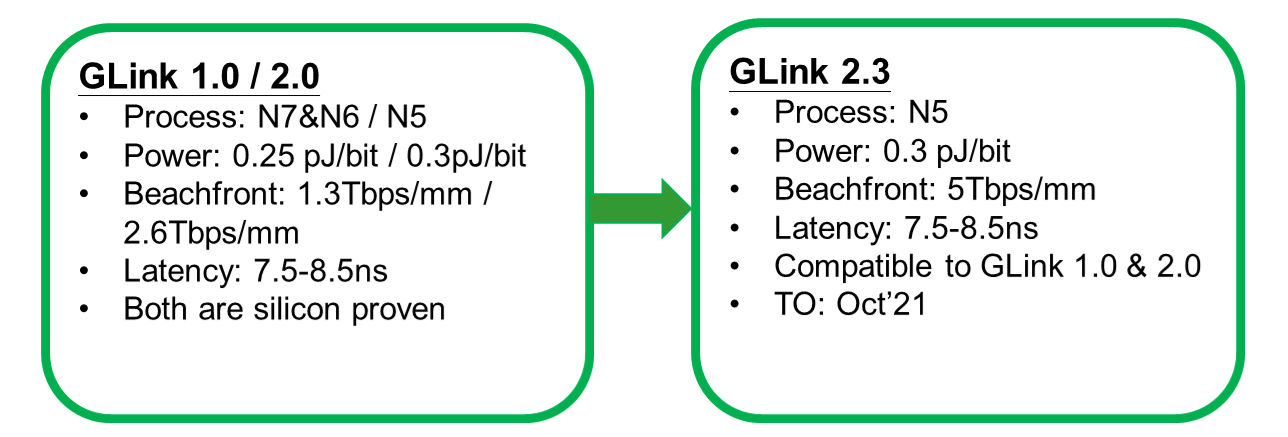 Continuing the momentum, we have successfully taped out N5 GLink 2.3 in Oct’21 and expected to have silicon report in 3Q22. GLink 2.3 is backward compatible with GLink 1.0 and 2.0, with almost double bandwidth per beachfront under similar power efficiency.