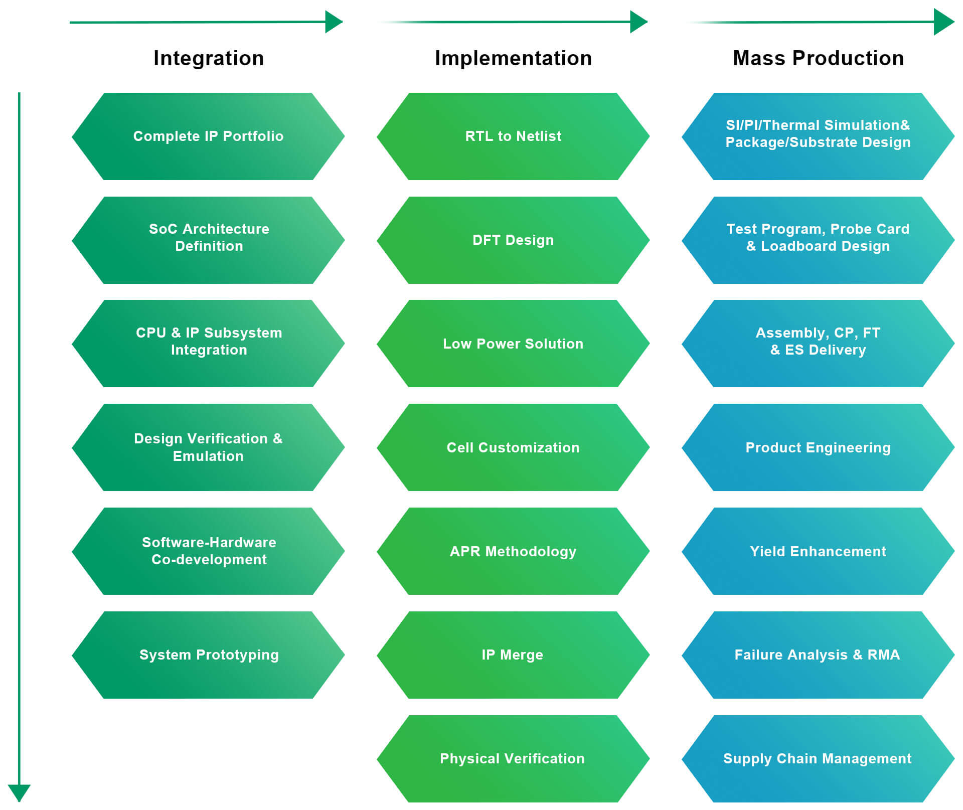 Besides, GUC provides IP hardening, IP test circuit/test pattern integration, SoC integration service from spec to GDSII or RTL to GDSII. GUC has successfully integrated complicated SoC and produced them in volume for hundreds of customer projects throughout the years.