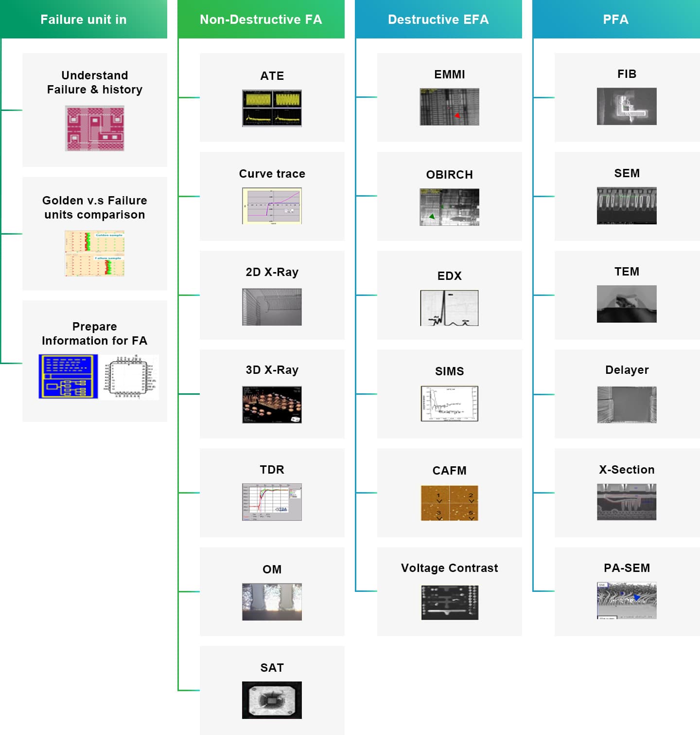 GUC cooperates with strategic labs to provide the complete and efficient failure analysis for RMA failure cause identification and production yield enhancement.