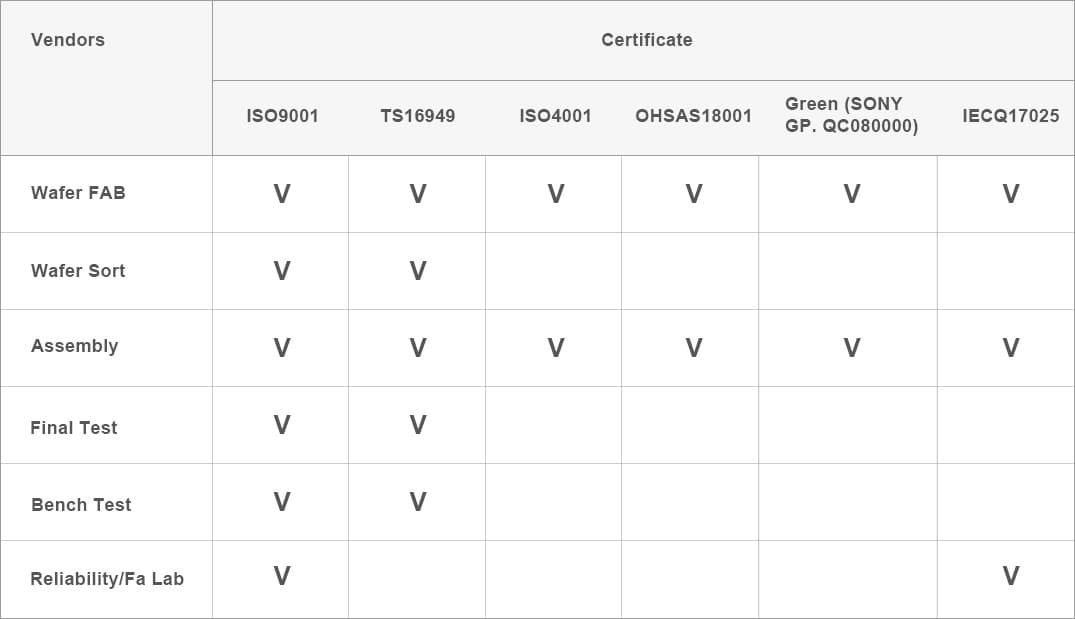 • All manufacturing service vendors passed ISO9001 Advanced Quality System Certificates.
